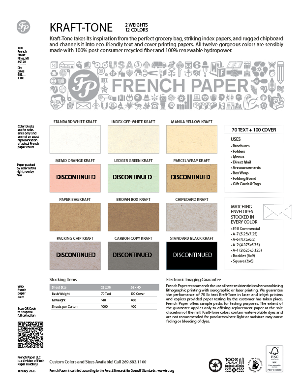 It's also a return to the French roots since many of our most popular papers branched off the look and feel of sturdy Made in America recycled utility papers. Kraft-tone combines the natural textures of wood fibers with a rich line-up of stylish colors.
