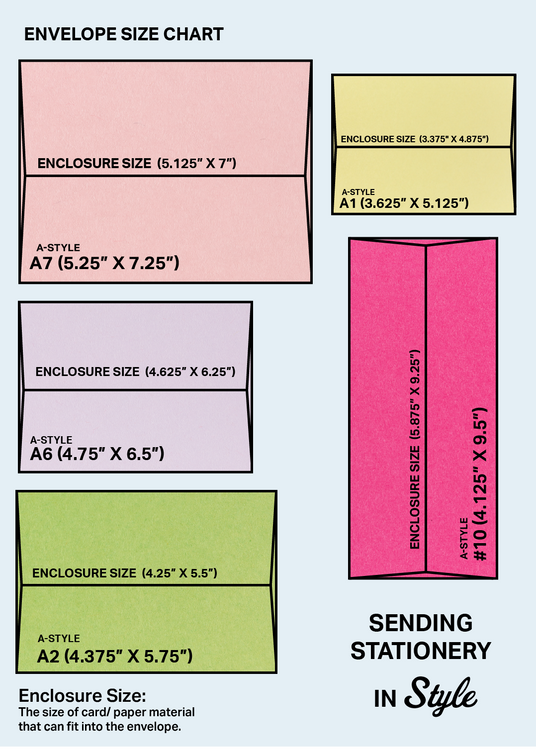 From personal notes to professional mailings, we’ve got you covered. Choose from classic sizes: A1, A2, A6, A7, and #10, all featuring a traditional square-flap seal for a timeless finish.